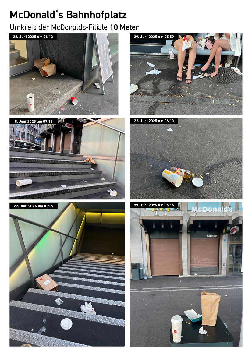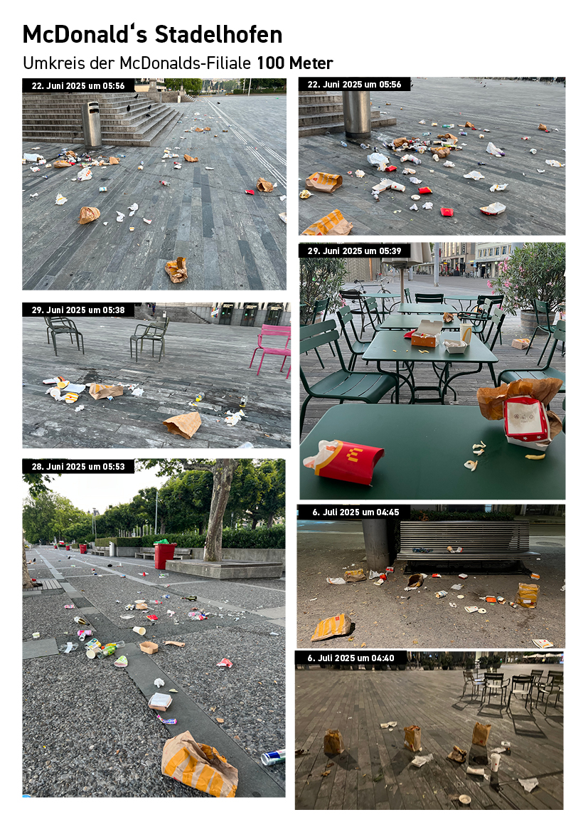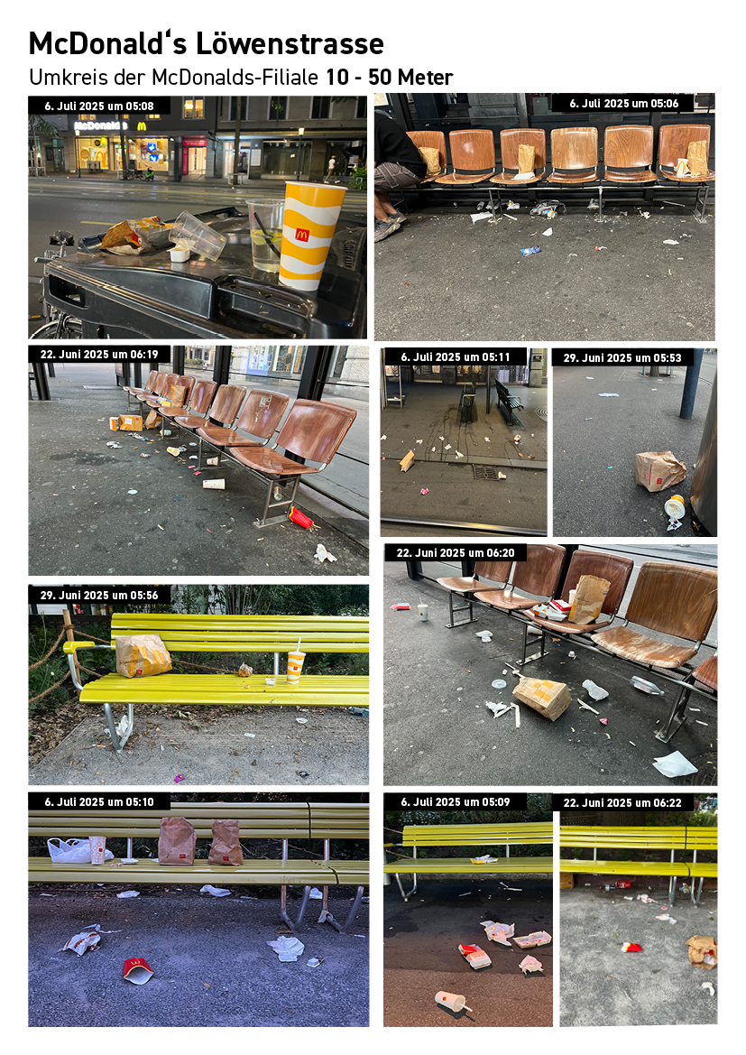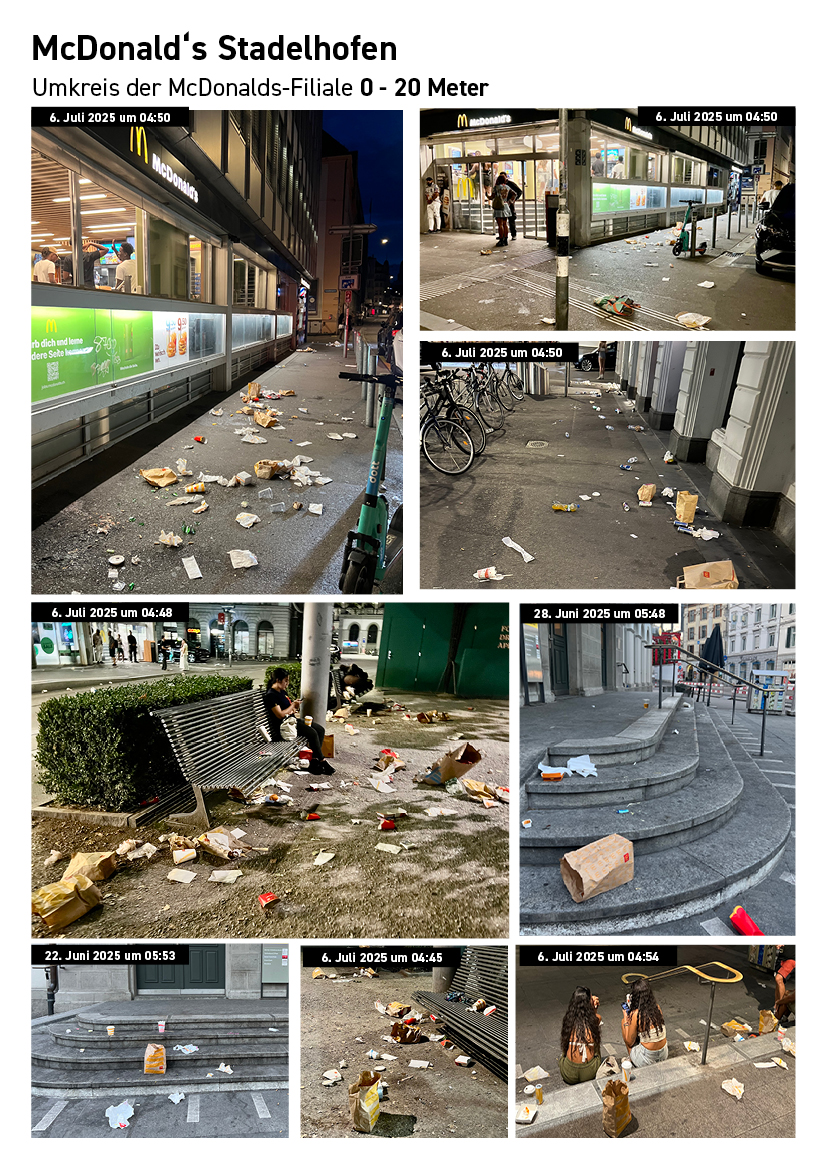 Die folgende Dokumentation zeigt die Abfall- und Nutzungssituation rund um bestehende McDonald’s-Filialen im Zürcher Stadtzentrum. Die Aufnahmen wurden standortbezogen gesammelt und dokumentieren Datum und Uhrzeit der jeweiligen Situation.