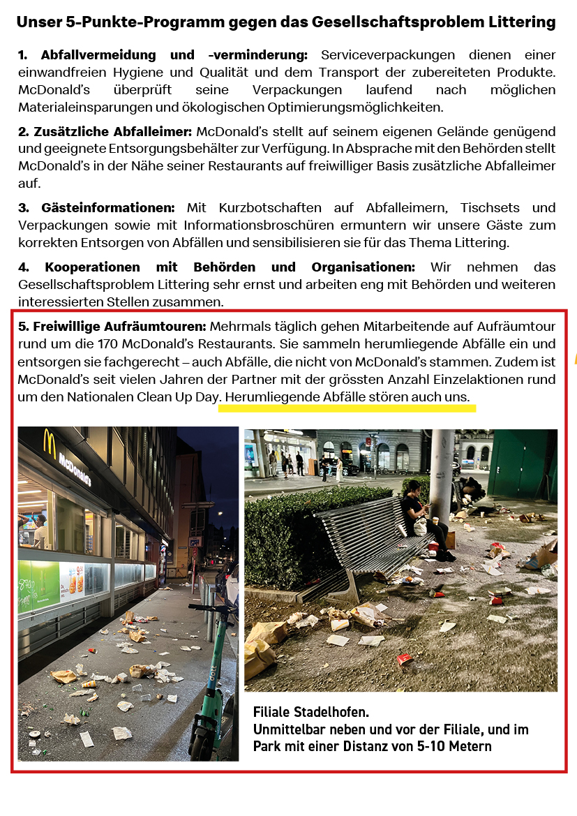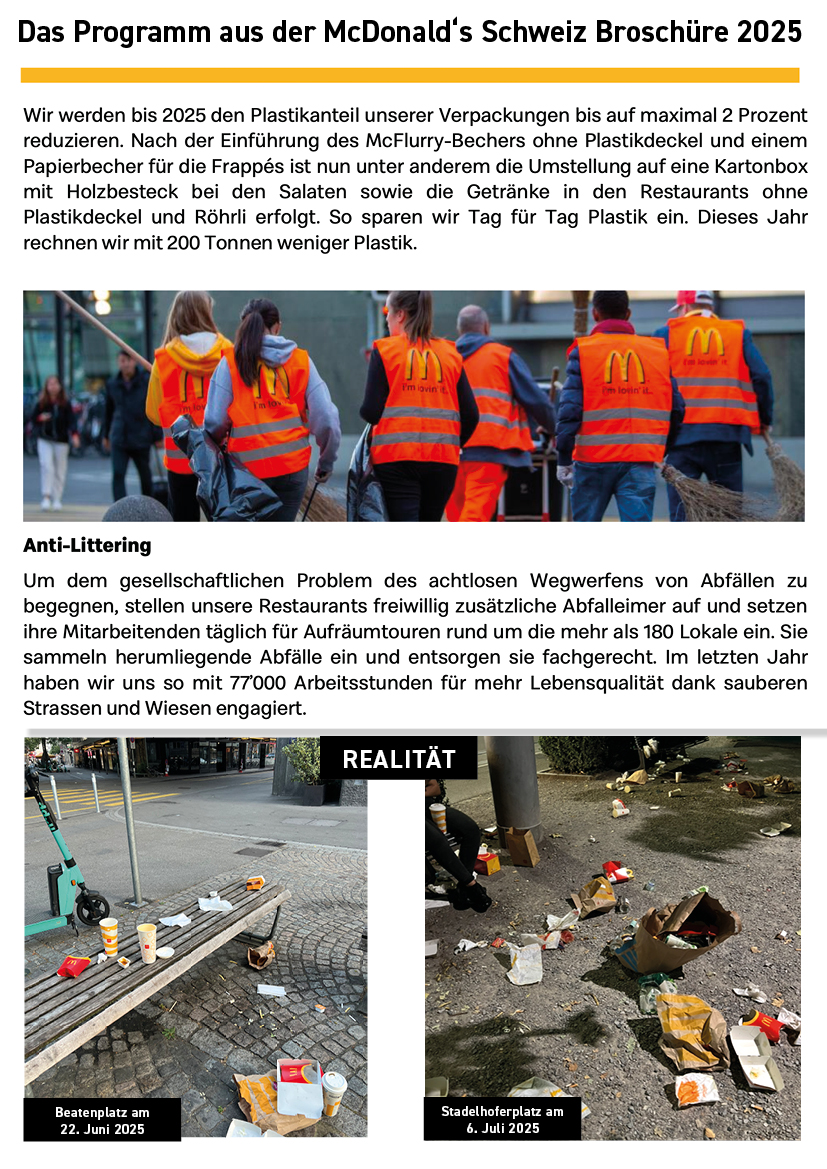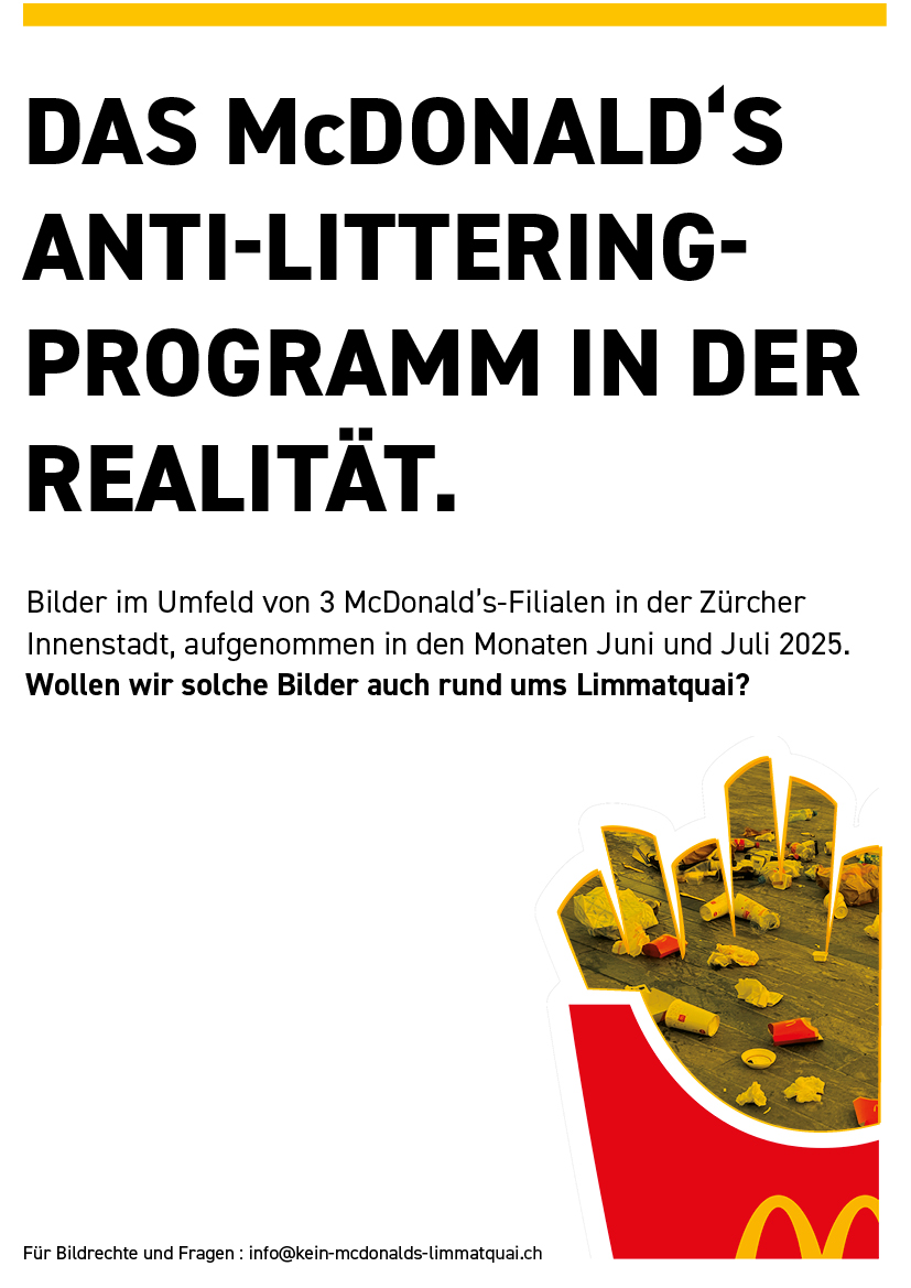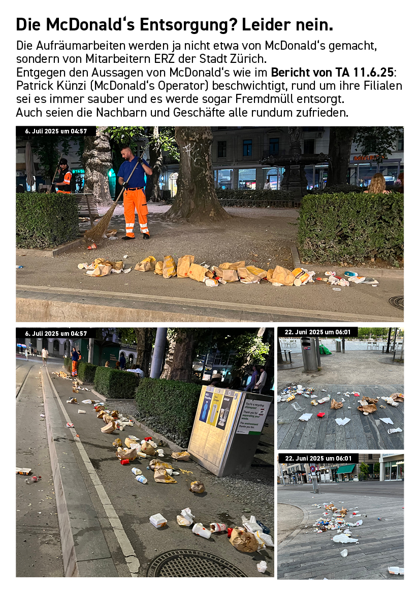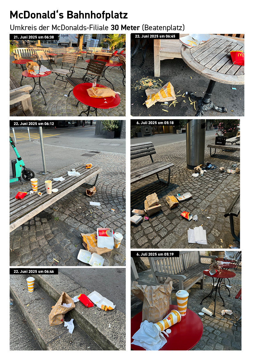 Die folgende Dokumentation zeigt die Abfall- und Nutzungssituation rund um bestehende McDonald’s-Filialen im Zürcher Stadtzentrum. Die Aufnahmen wurden standortbezogen gesammelt und dokumentieren Datum und Uhrzeit der jeweiligen Situation.